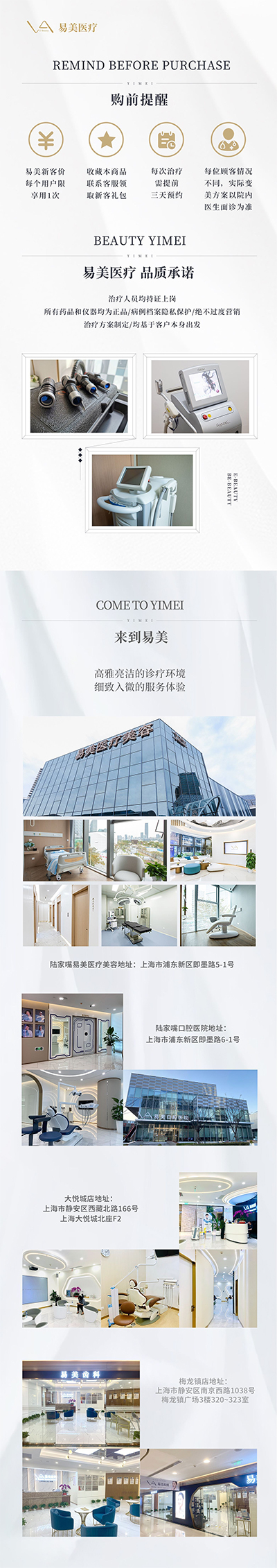 易美医疗美容坐落于繁华的陆家嘴滨江,汇聚了上海九院副主任级医师带领的医疗团队,以独树一帜的个性色彩美学为导向,定制化蜕变方案,帮助您成为绚丽多姿的自己。