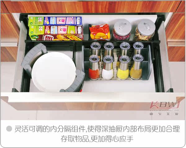 就是抽屉两边不是木板,是玻璃板,可以装配套的抽屉内隔板,如下图: