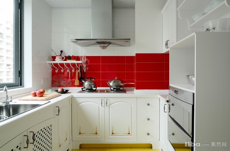 厨房强调功能为主,同样采用大量色块,油烟机以下采用耐脏的红色,简洁实用