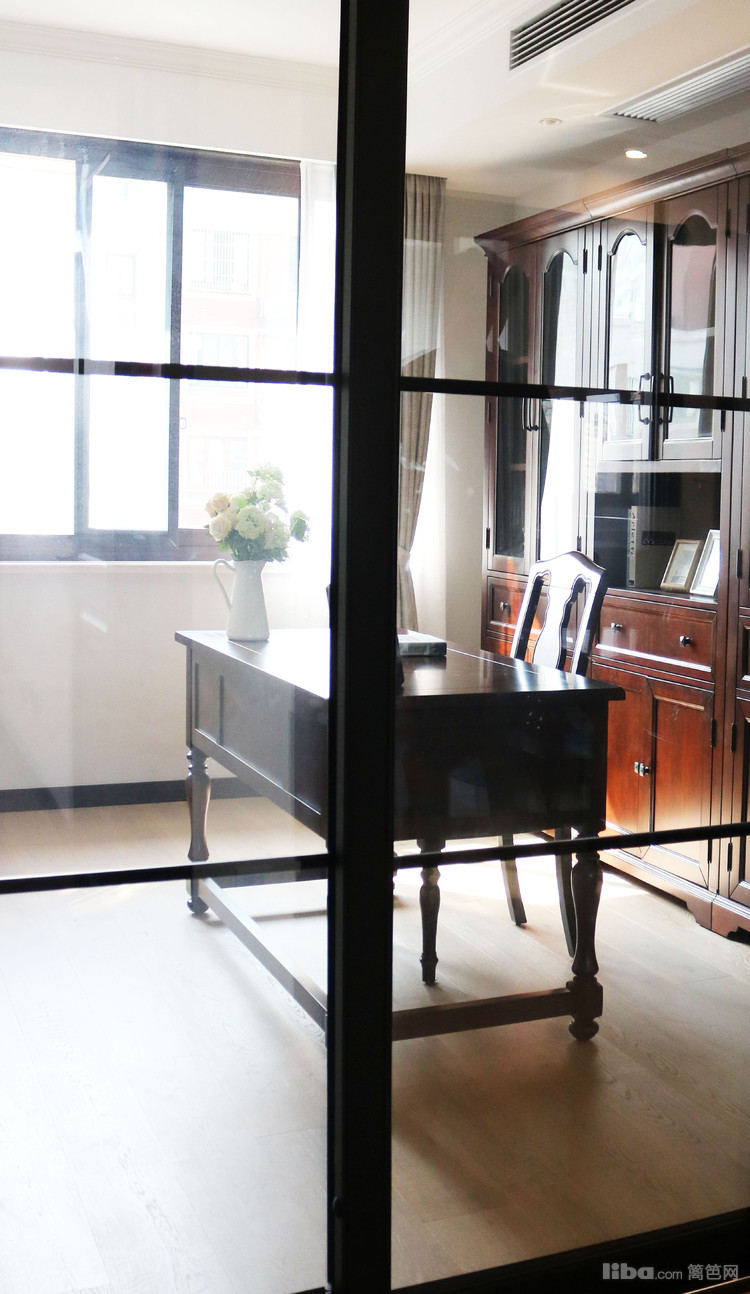 开放式的书房,与客餐厅的家具配合的天衣无缝,轻奢质感的书桌和书柜,显得书房安静高雅温润有加。同时,两面采光的设计,即使不开灯,整个空间照样通透明亮。