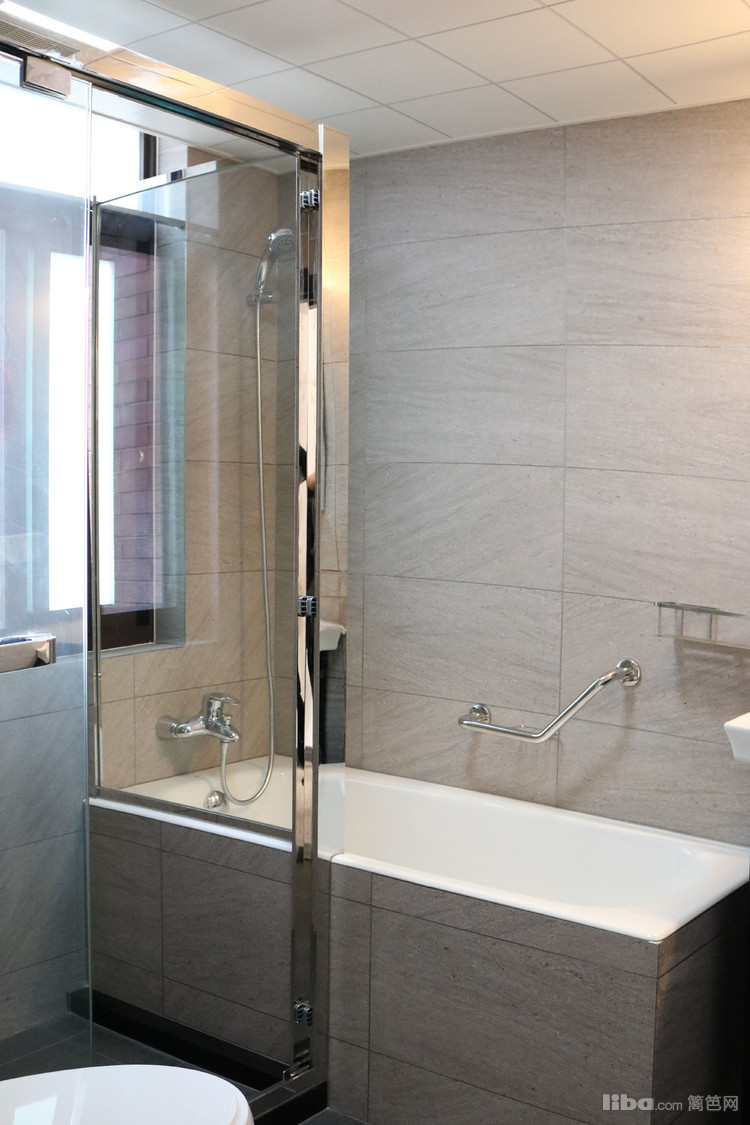 主卧卫生间设置了浴缸,银色龙头以及拉手、置物架、无边框自带灯的镜子~~每一件、每一物,在精心挑选的搭配下,尽显女主人对生活品质的高要求,精致细腻而又高雅。