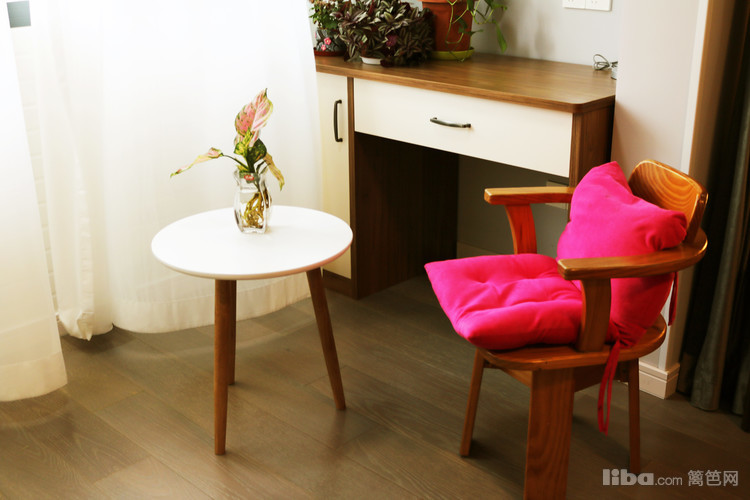 卧室在硬装界面质感色调都比较光滑平淡的前提下,软装设计在各区域的装饰搭配上寻求变化与层次。在阳台上设置了一个小桌子,可以当收纳柜也可以当作梳妆台,非常的具有人性化。