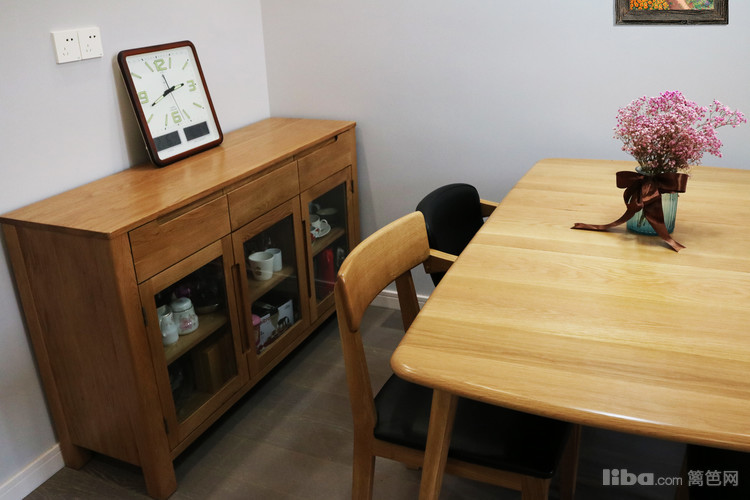 纯实木四人餐桌椅,造型简洁大方,质感温润自然。墙面为挣脱“简单”的头衔,设计师搭配北欧等的挂画等装饰品,在丰富空间的同时还为整块区域添加活力,增添自然气息。
