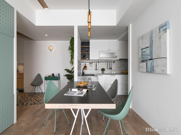 吧台和餐桌融为一体,和周围色系做到了一个互补搭配