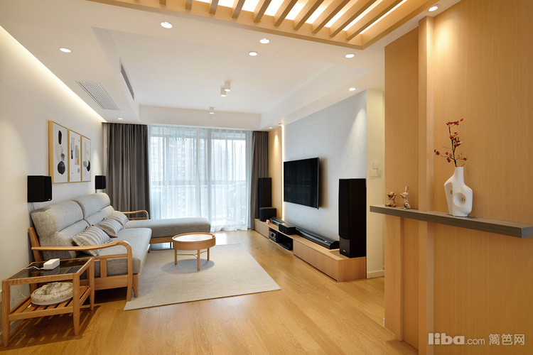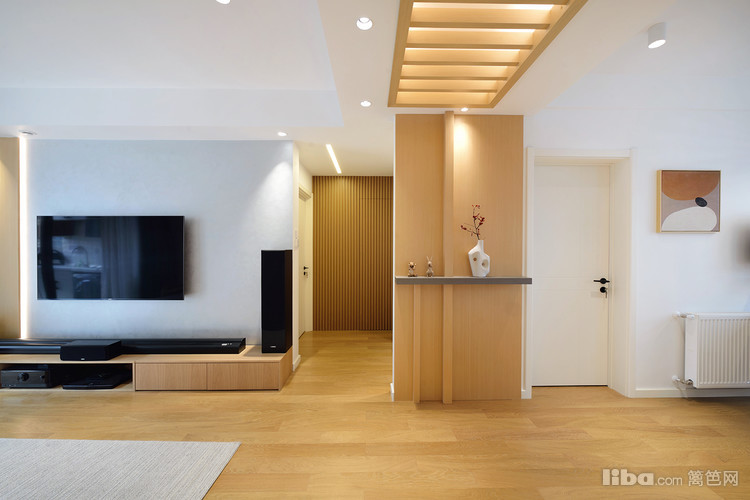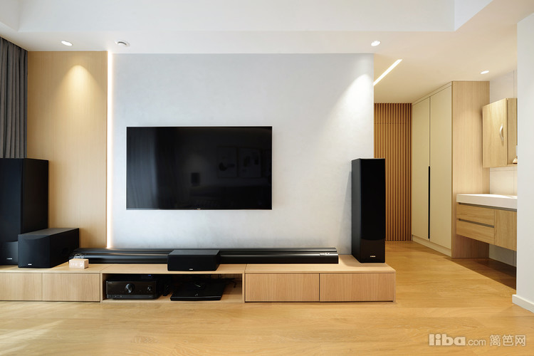 客厅空间以浅暖灰和原木色搭配,清新温柔。光源的设计上采用无主灯作为主要照明,做了反光灯和柜内灯作为辅助照明,在不需要射灯作为主要照明时可单独开反光作为照明,灯带光晕柔和,更加温馨。