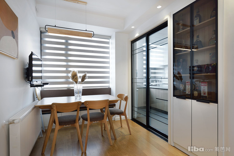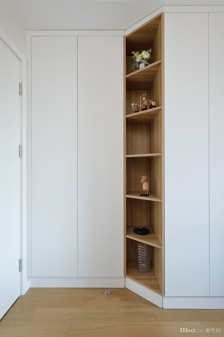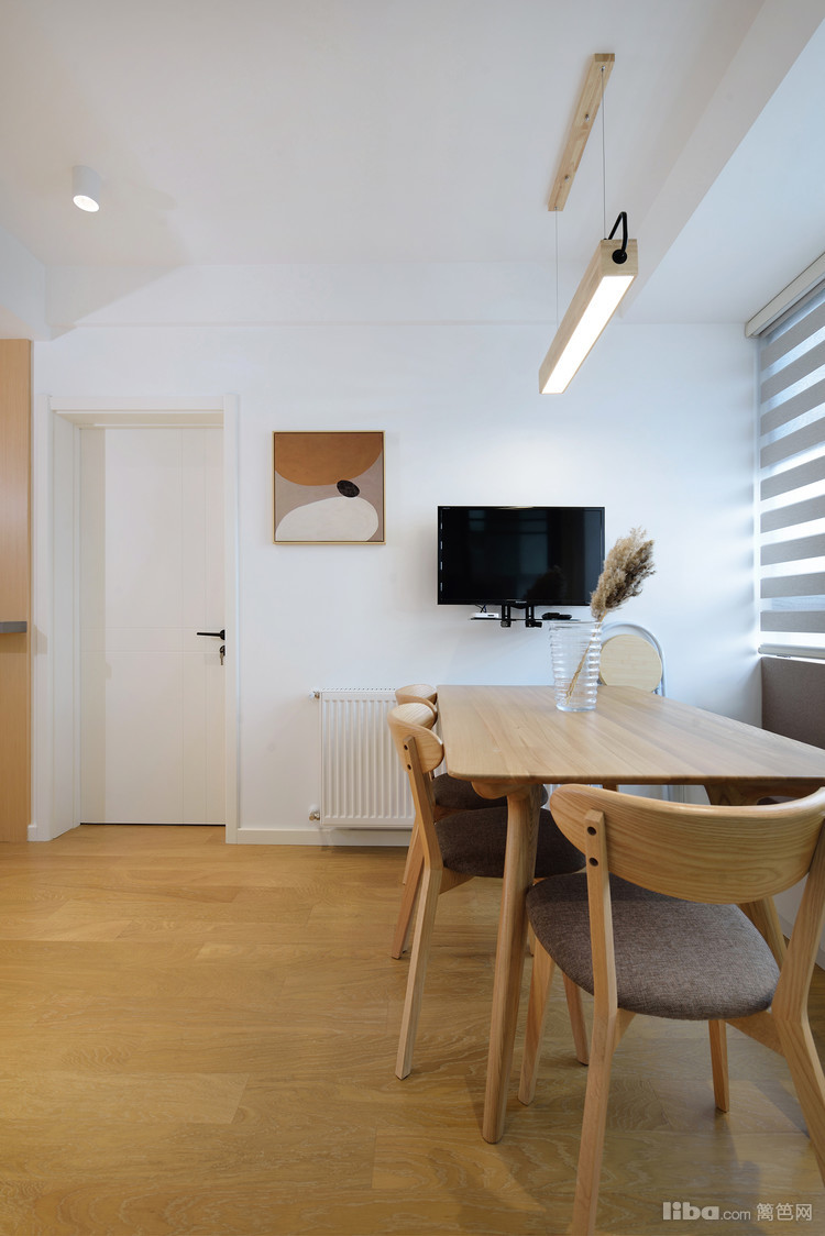 大量留白的墙体、原木和靠墙放置的素雅饰品,彼此之间互相关联,营造出清雅的空间氛围。