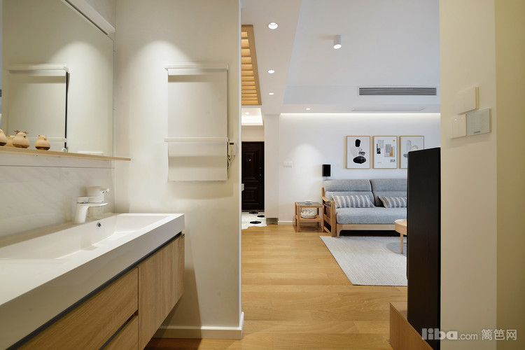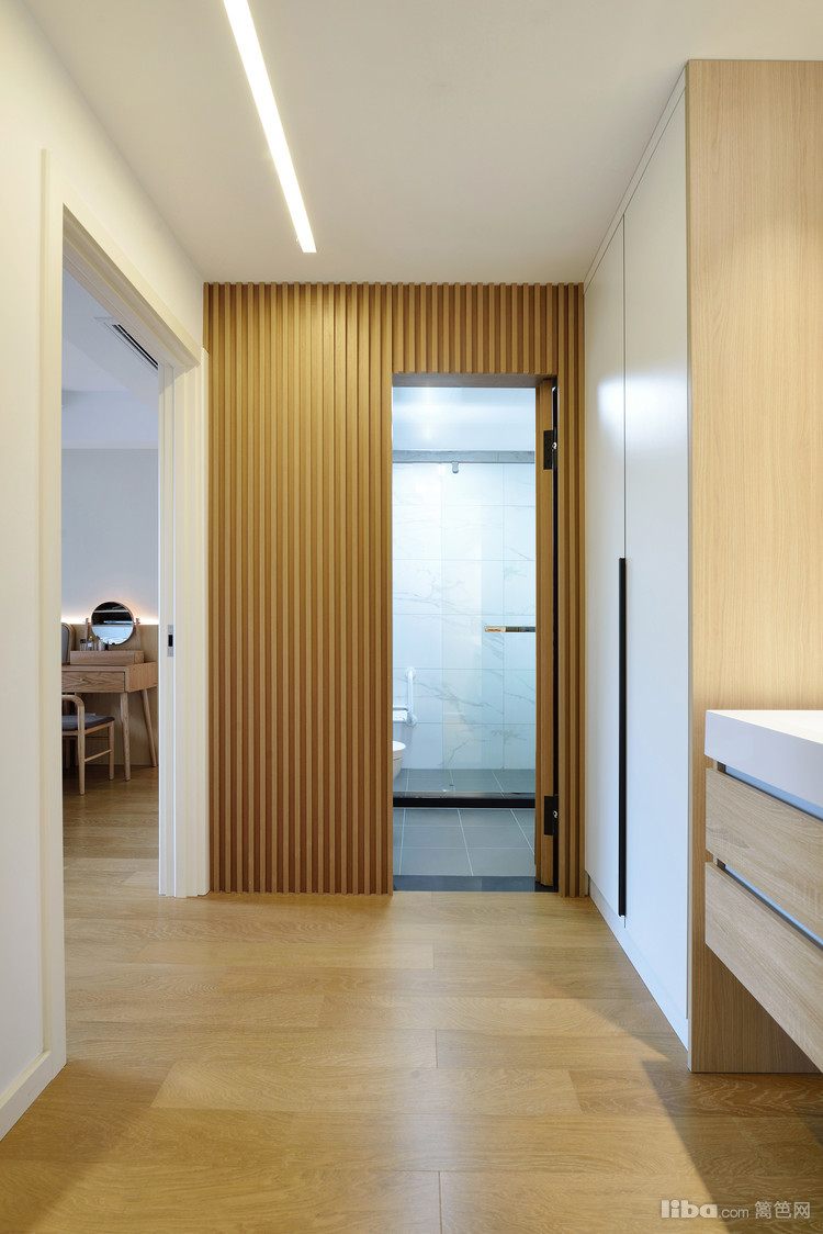 卫生间将洗手台外置,提高了日常使用效率。原木色调的墙体与大理石墙砖的纹理相呼应,视觉上营造了延伸的效果。