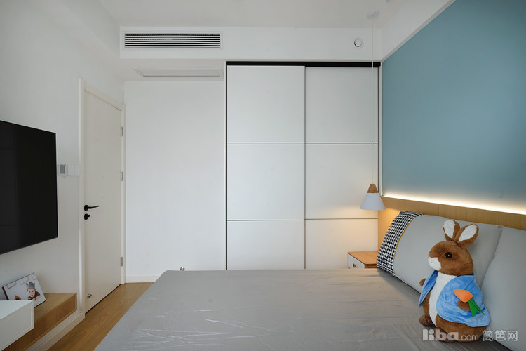 卧室电视柜部分用了组合柜的方式来做,整面柜体扩大了收纳空间。