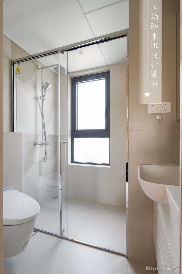 次卫:奶油色墙地砖统一色调,镜柜+悬空浴室柜兼顾储物与清洁便利性。