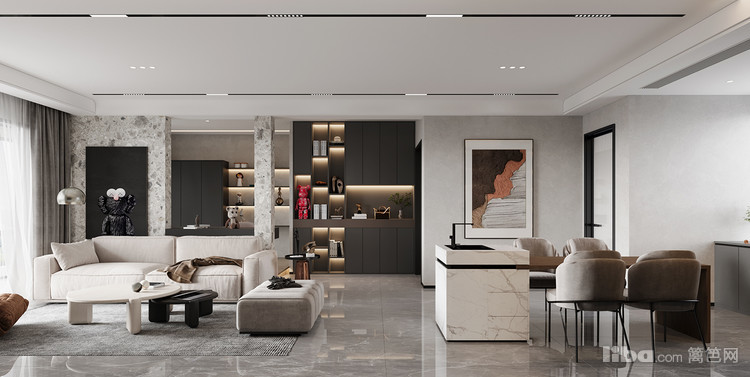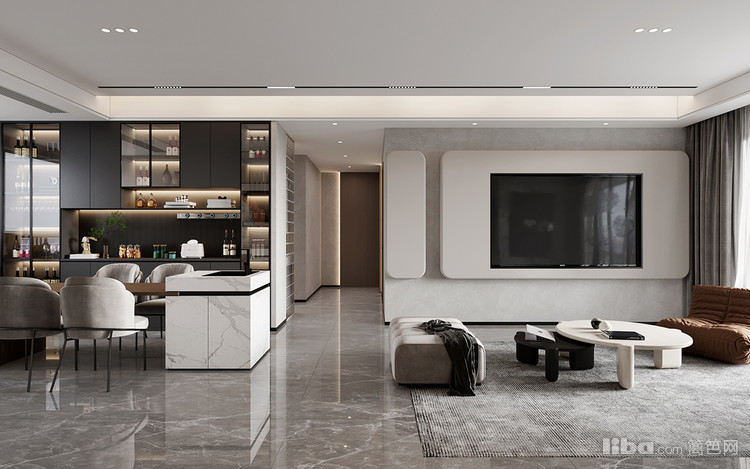 以现代简约为设计核心,通过简洁的线条、通透的空间布局,搭配质感十足的材质,营造出开阔且舒适的客厅氛围,同时融合实用功能与美学设计,让空间既适合日常休闲,又具时尚格调。
