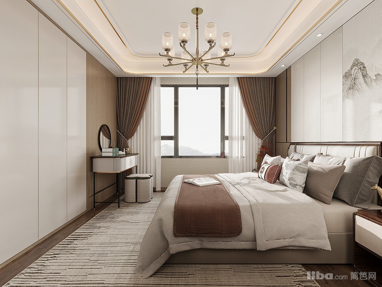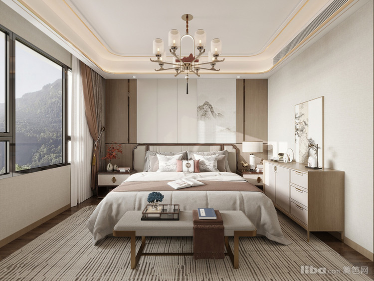 以营造舒适雅致的休憩空间为核心,采用柔和色调搭配精致吊灯与简约家具,结合窗外景致,打造出温馨且具品质感的卧室,让居者能在此尽享放松与静谧。