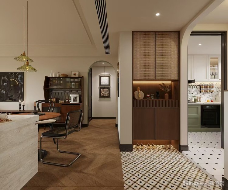 通过复古花纹地砖、藤编元素柜体,结合柔和灯光,打造出兼具复古质感与现代便捷的过渡空间,既起到空间衔接作用,又展现出独特的美学品味。