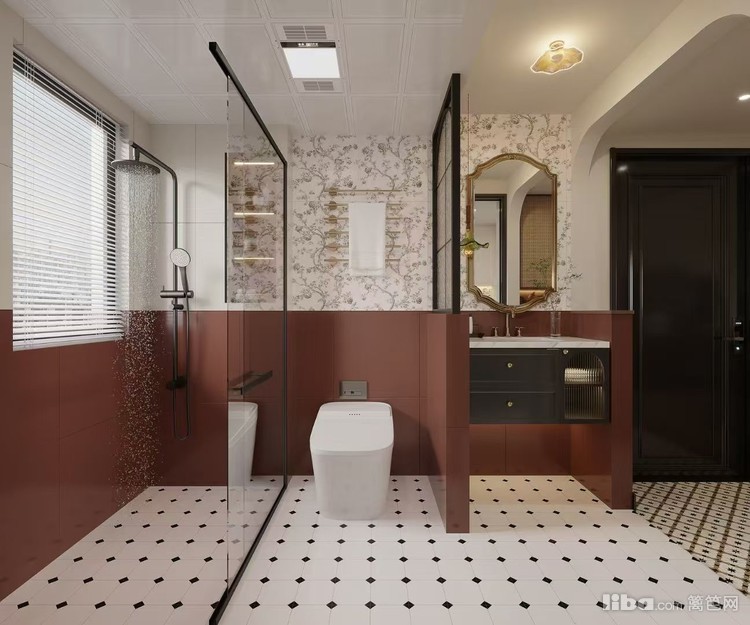 融合复古与现代元素,花纹墙面、复古造型镜子搭配现代卫浴设施,合理的空间分区与柔和灯光,打造出一个兼具美观与实用的复古风卫浴空间。