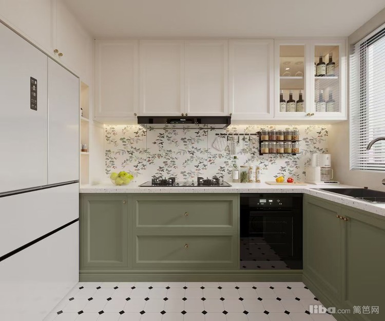 以清新复古为风格,白色与绿色柜体搭配碎花墙面,简洁的布局与充足的收纳空间,既满足烹饪需求,又营造出温馨且富有复古情调的烹饪环境。
