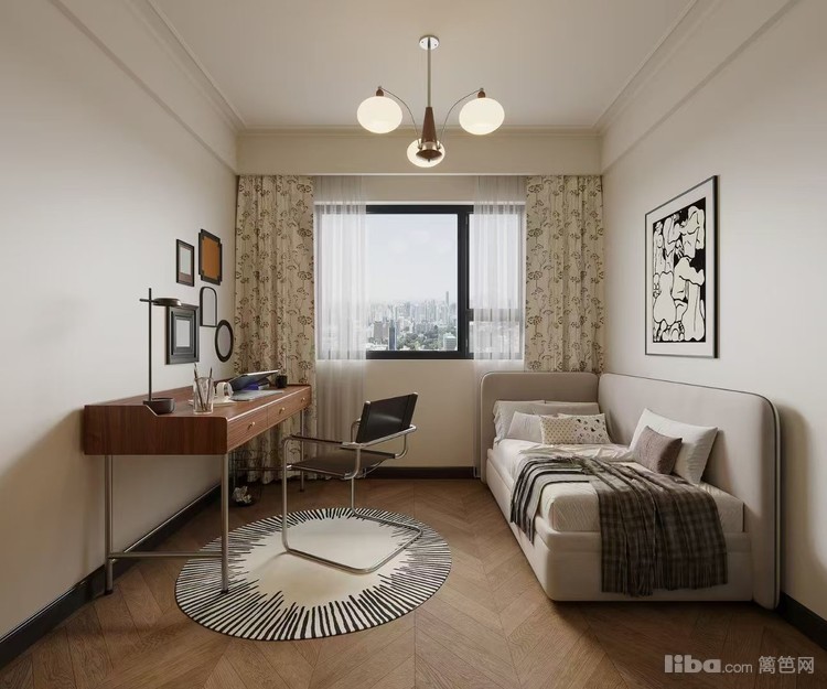 将复古与实用结合,复古花纹窗帘、独特造型的吊灯,搭配简洁的书桌与床具,打造出一个既能满足工作学习,又能提供休憩空间的多功能区域,充满文艺复古气息。