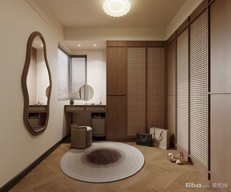 运用木质与藤编元素,打造出自然复古的氛围,独特造型的镜子与圆形地毯增添空间美感,充足的收纳空间满足衣物整理需求,营造出雅致的梳妆收纳空间。