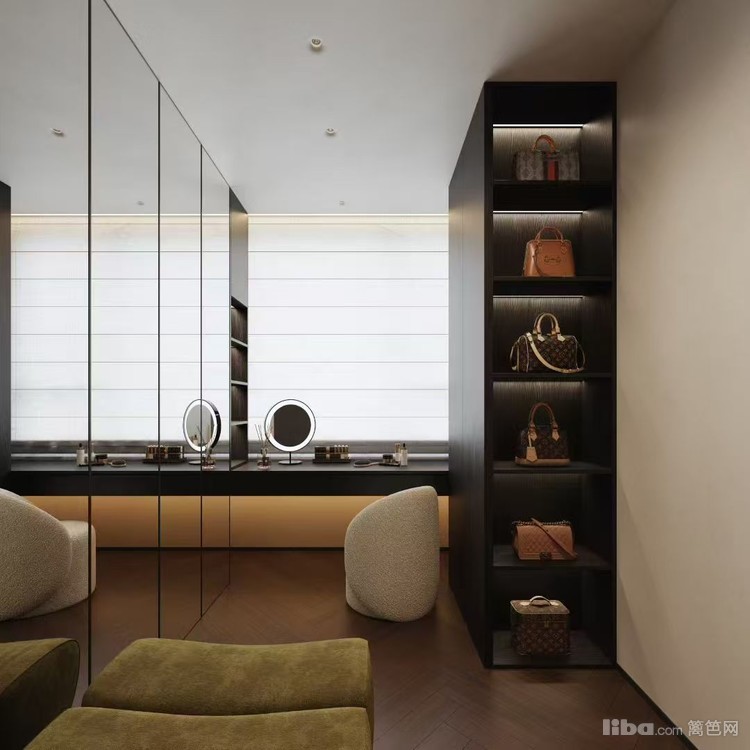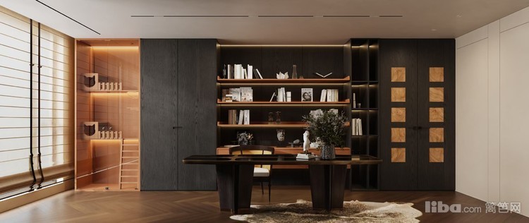 现代简约风格为主,深色柜体与暖光结合,打造出沉稳且富有格调的阅读办公空间。充足的收纳与展示空间,方便业主存放书籍与展示藏品,大窗户引入自然光线,让阅读办公更舒适。