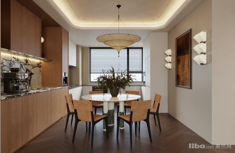 采用现代简约与轻奢结合的风格,木质橱柜搭配大理石元素,彰显品质感。独特造型的吊灯与圆形餐桌,营造出时尚且实用的烹饪与用餐空间,满足业主家庭聚餐与日常烹饪的需求。