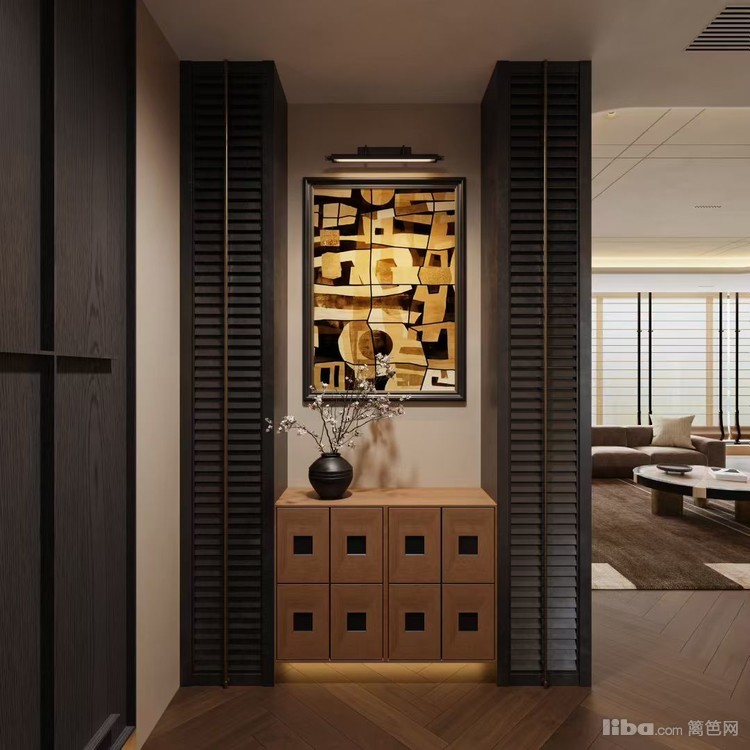 以现代轻奢风格打造,利用木质柜体、艺术挂画与精致摆件,营造出雅致且有仪式感的入户空间。灯光设计突出装饰细节,既满足收纳需求,又展现出业主的艺术品味,为家居空间开篇营造良好氛围。