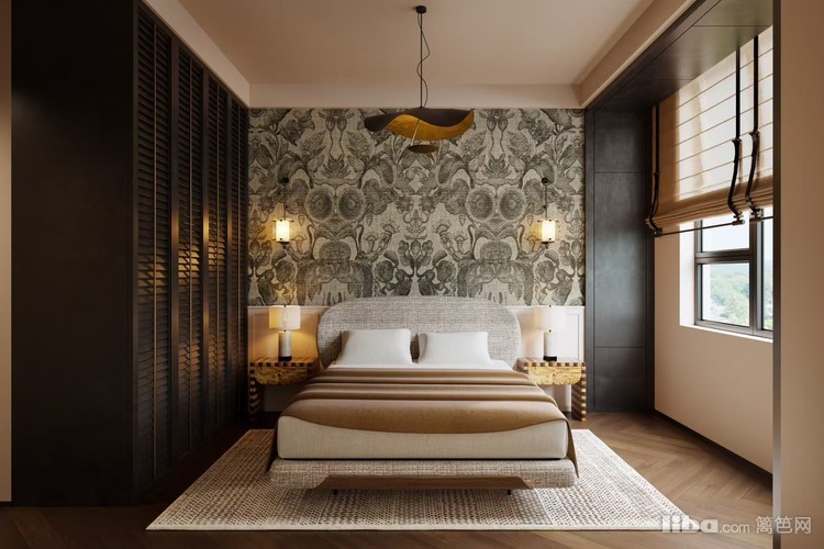 融合复古与现代元素,花纹背景墙、复古造型灯具与简约床具结合,营造出静谧且富有艺术氛围的休憩空间。柔和的灯光与自然材质,为业主打造放松身心的睡眠环境。