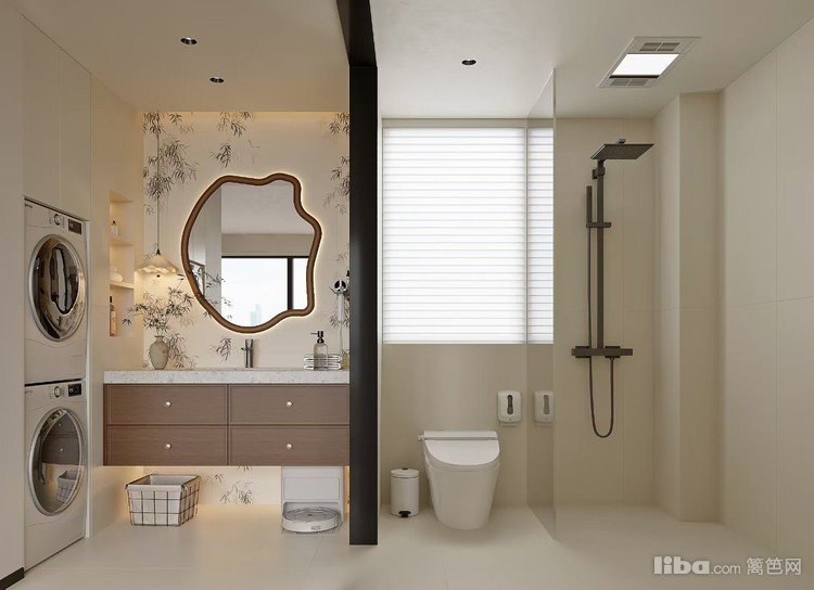 现代简约风格为主,合理分区满足洗漱、洗衣等功能需求。独特造型的镜子与柔和灯光搭配,增添空间美感,整体布局简洁实用,营造出整洁且舒适的卫浴环境。