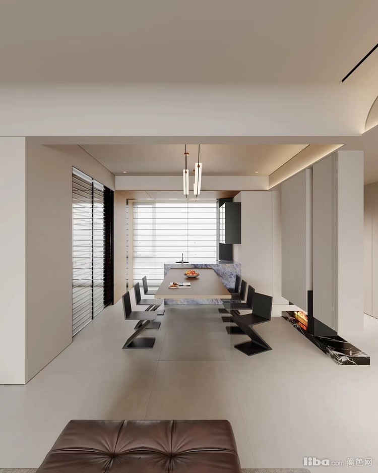 秉持“极简与功能融合”的设计理念,以简洁的线条和纯净的色调构建空间。大幅百叶窗引入柔和自然光,提升空间通透感。餐桌椅造型简约现代,材质上注重质感,满足用餐与社交需求。