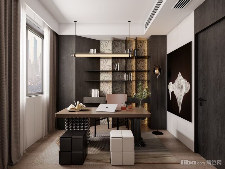 以现代简约为风格,书房通过简洁的线条、实用的布局,搭配艺术装饰,营造出静谧、专注的阅读与工作空间。