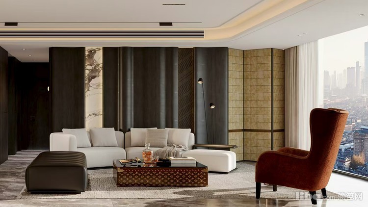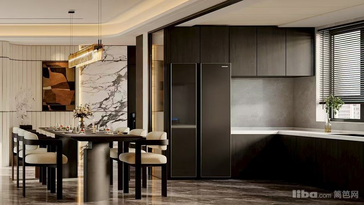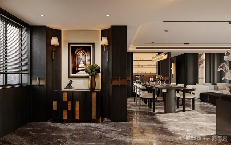 采用现代轻奢风格,以深色系为基底,搭配大理石、金属等质感材质,辅以精致装饰与柔和灯光。