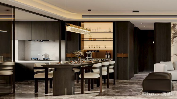 以现代轻奢为基调,餐厅运用深色系搭配精致灯具,结合质感材质与艺术装饰,营造出时尚优雅、富有格调的用餐氛围。