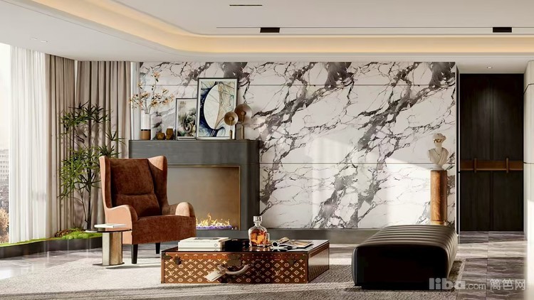以现代轻奢为风格,运用深色系与大理石等质感材质,搭配精致装饰与柔和灯光,打造出时尚高贵、舒适雅致的客厅空间。