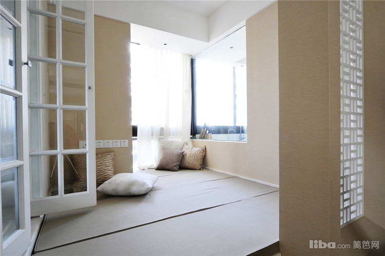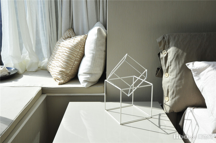 卧室采光极好,稍稍加一点驼色,视觉上柔化,既能衬托MUJI的自然,又能增强层次感,不至于太过单调。阳台的一隅也展现矛盾与冲突,柔软的织物对比桌面的立方体硬朗的线条。