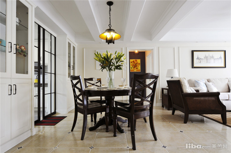餐桌置于客厅与厨房之间,让餐厅于无形中绽放开来,让深棕色的十字餐椅与厨房黑色格子移门有了形态上的互动,舒适讨巧。