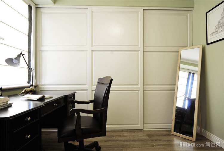 书房的抹茶绿非常符合女主文青的气质,清新满溢,干净简洁的格子移门后是衣帽间,男主人负责才华横溢,女主人负责貌美如花,如此甚好。
