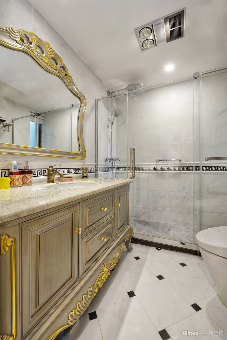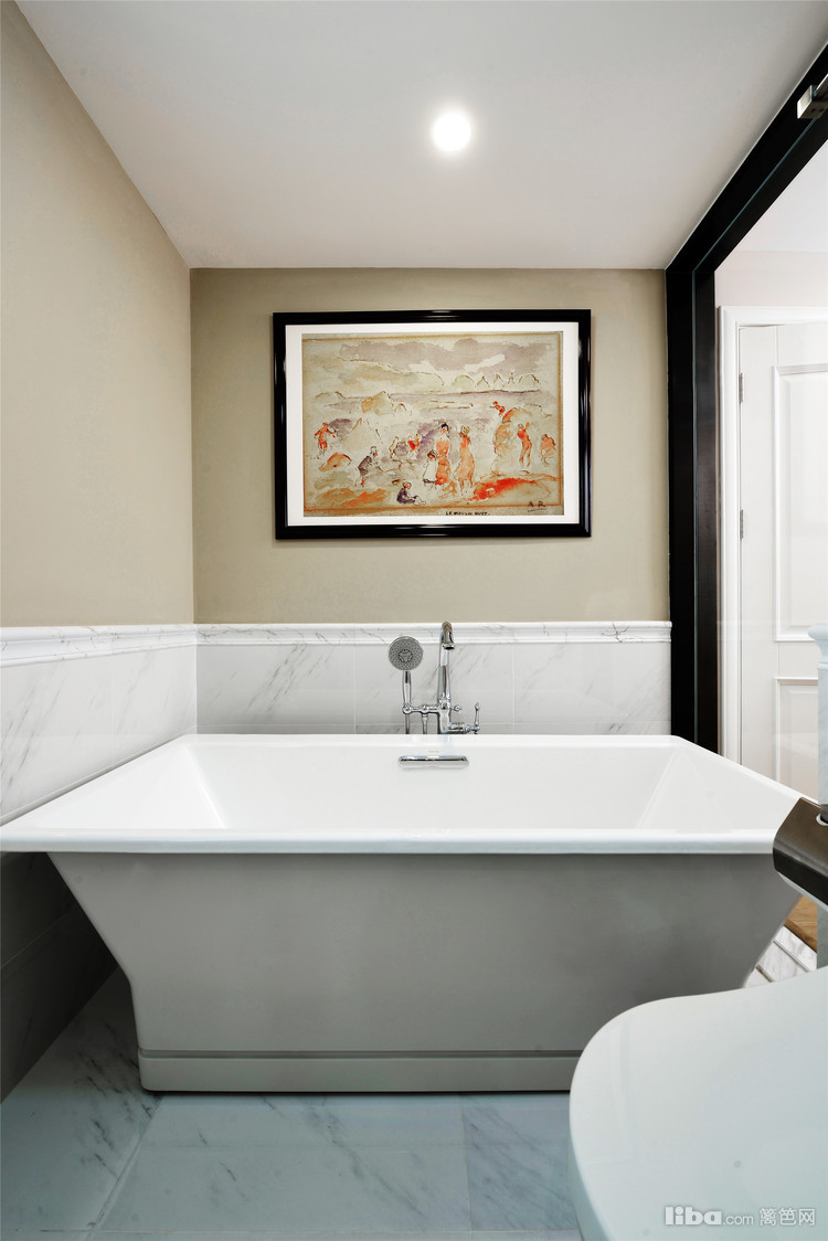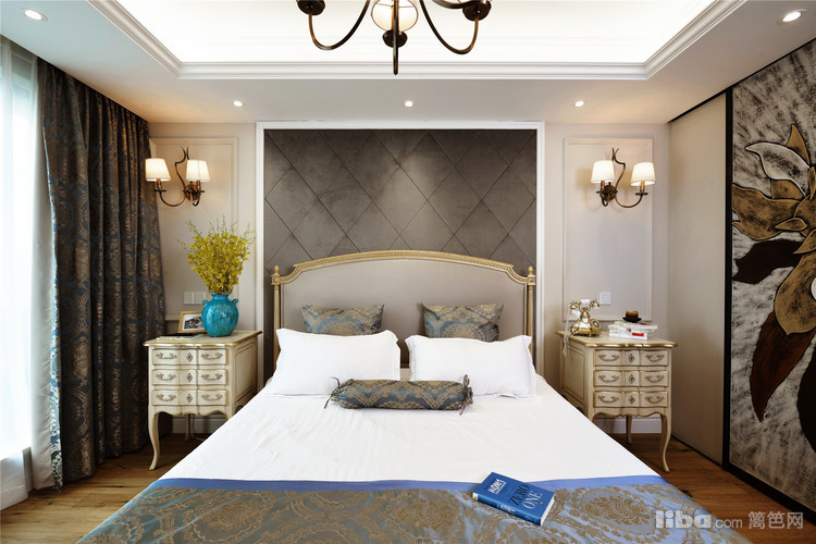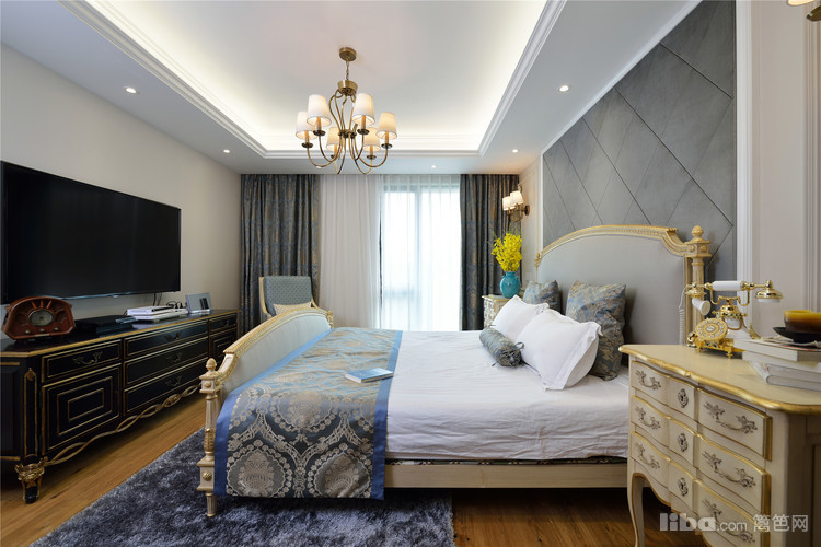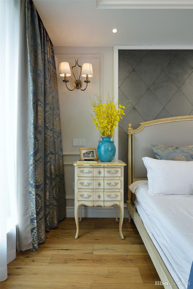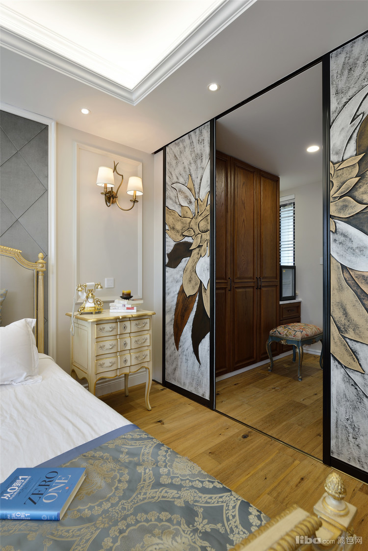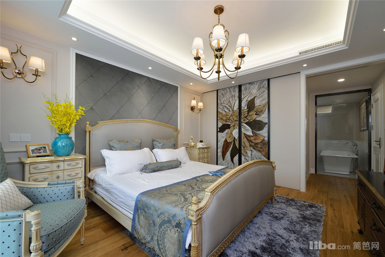 整个卧室采用套间形式,只一面手绘移门便将空间做了完美的功能区分。在以白金和天空蓝做主色的空间里,浅灰绒布背景墙和黑金电视柜的深入浅出,于浪漫妩媚的情怀中注入了一抹骑士般的尊贵华丽。