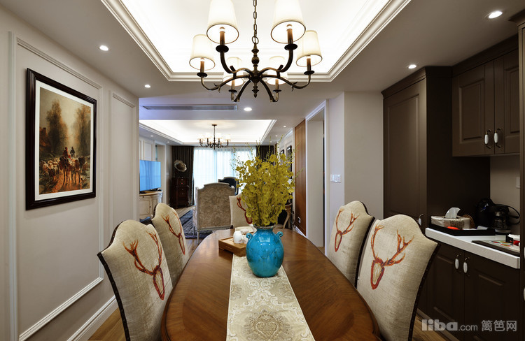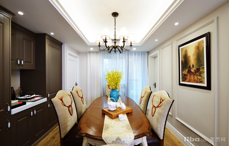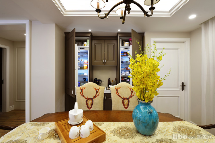 深棕色餐边柜凝聚了视觉焦点,使空间显得大气沉稳。曼妙的窗帘姿容,梦幻的鹿头绒布,唯美的丛林壁画,顷刻间相映成画,仿佛置身于大自然间。而这一切美的存在,都要感谢隐藏式冰箱的成全。