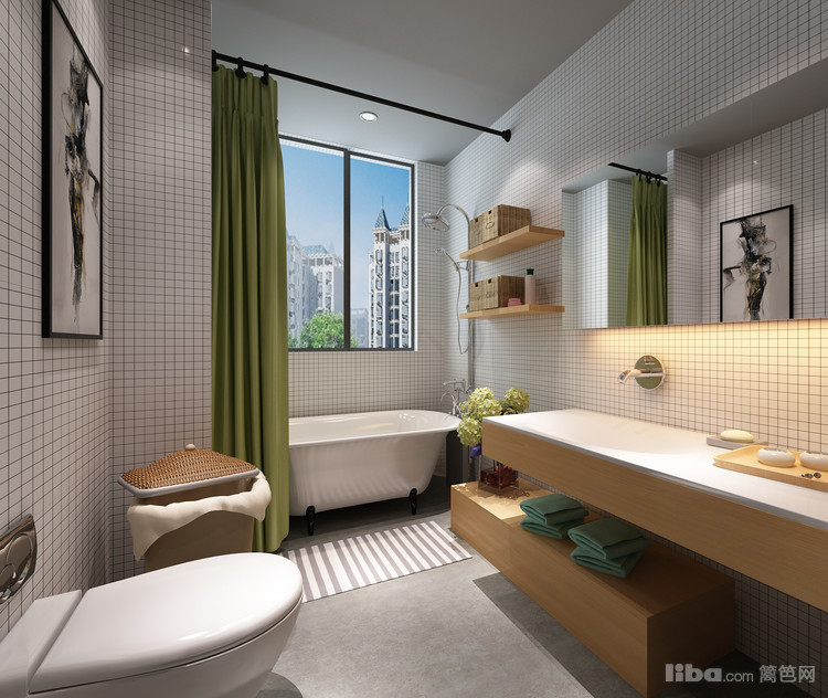 主卫,白色马赛克直入眼帘,整面墙的镜面柜扩大了空间即视感,镜中画台盆下那素净的原木,而略显禅意,将整个空间提升到了一个更高的境界,宁静祥和。