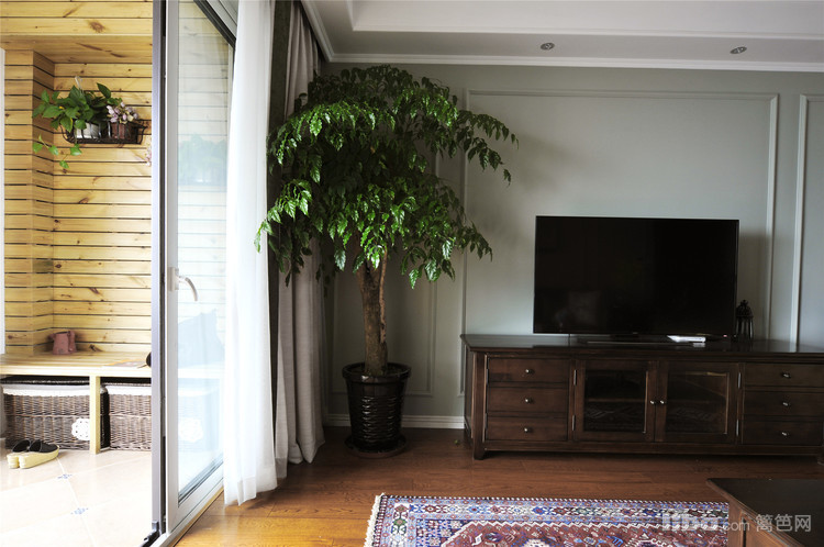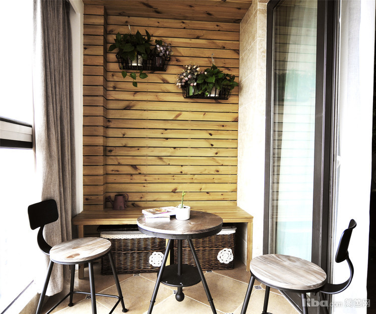 南阳台与客厅衔接,带着年轮烙印的结痂卡座与背景及顶面连成一片,一张圆桌,三两盆栽,一个梦中的花园阳台如约而至。