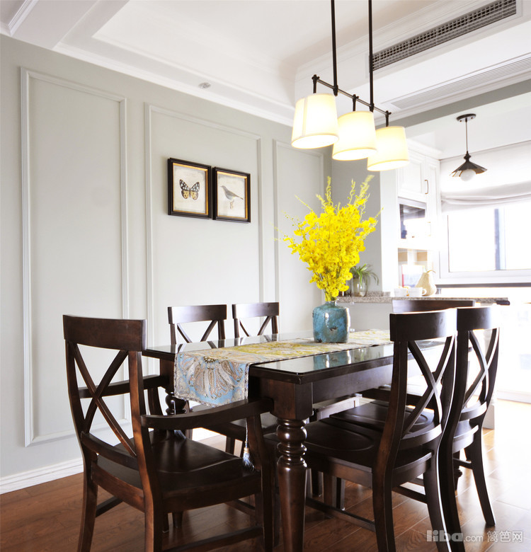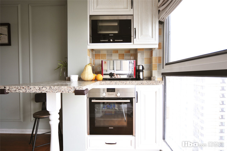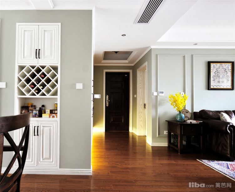 看似寻常的餐厅,其实有着大玄妙。一来这个酒柜是依设计师要求现挖的墙洞,新辟的储物空间;二来因原厨房面积有限,设计师将餐厅与北阳台打通,用吧台过渡,增设了西厨,完成了功能上的统一。
