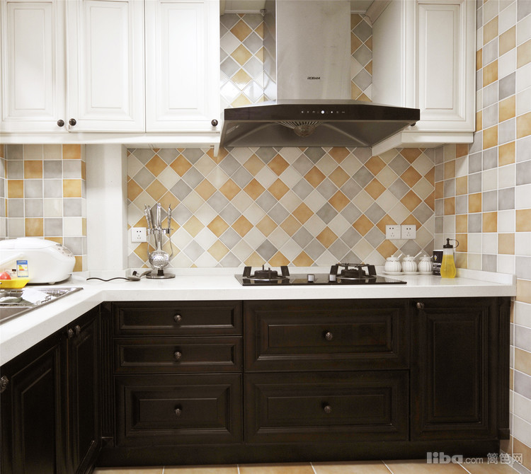 厨房上浅下深的柜体分布,让视觉重心上扬,经典灰白与橙色的拼花,就像一串跳跃的音节,纯澈明亮。