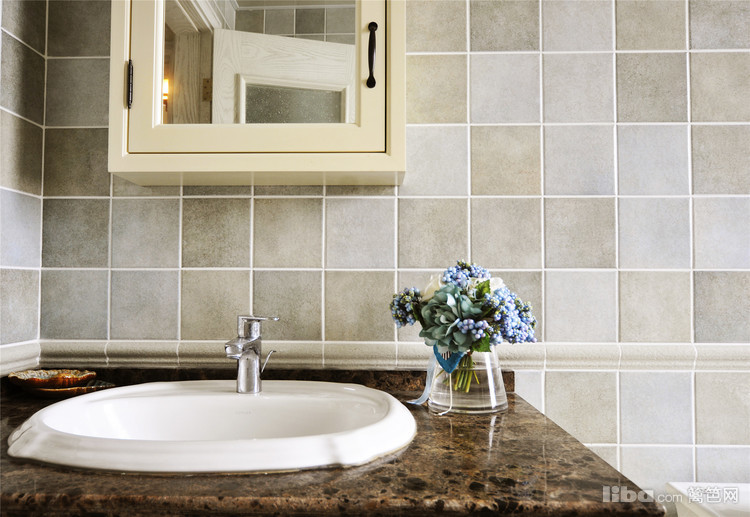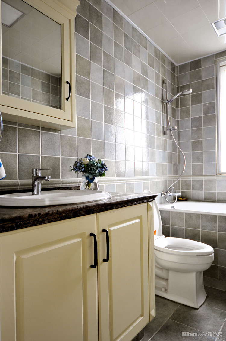 黄色镜柜不仅美观,还能将细碎收纳,灰色拼花小砖,复古有腔调。