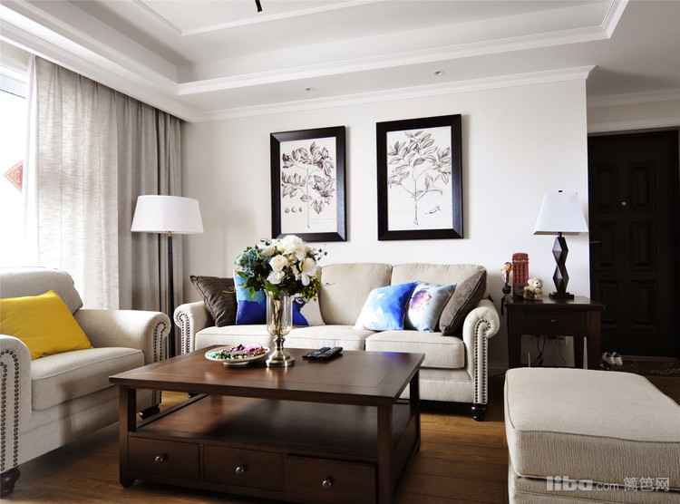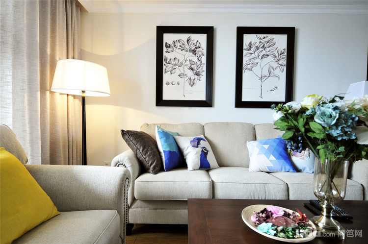 「客厅」不多修饰,简简单单两幅树枝素写分分钟将思绪放飞丛林,一落地一台灯的不对称运用与沙发和脚凳的对比相得益彰,光氲一圈一圈,柔软的棉麻表面,时光也变得温柔。