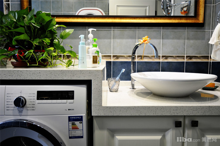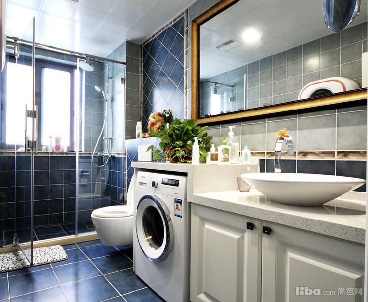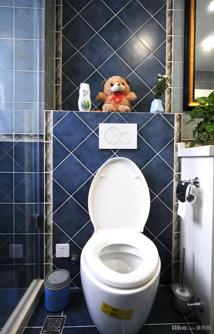 「主卫」在深海蓝的渲染下,仿佛游走在浩瀚的海洋里,无论是金色镜框、白瓷碗盆,还是马桶一角,皆带有超凡的静谧感受。