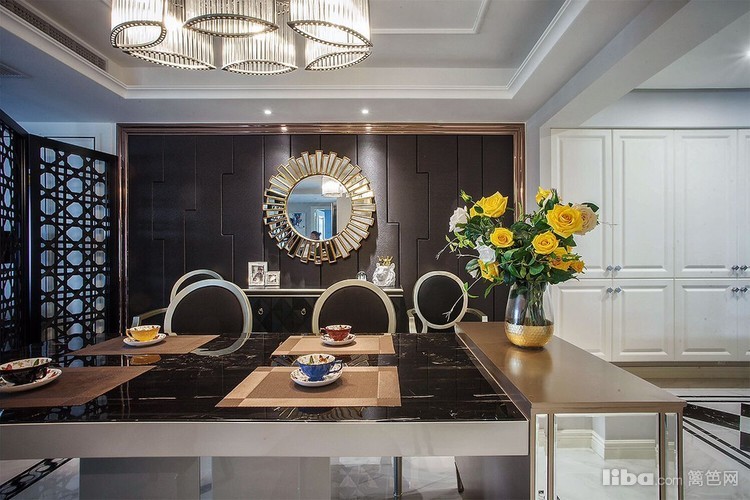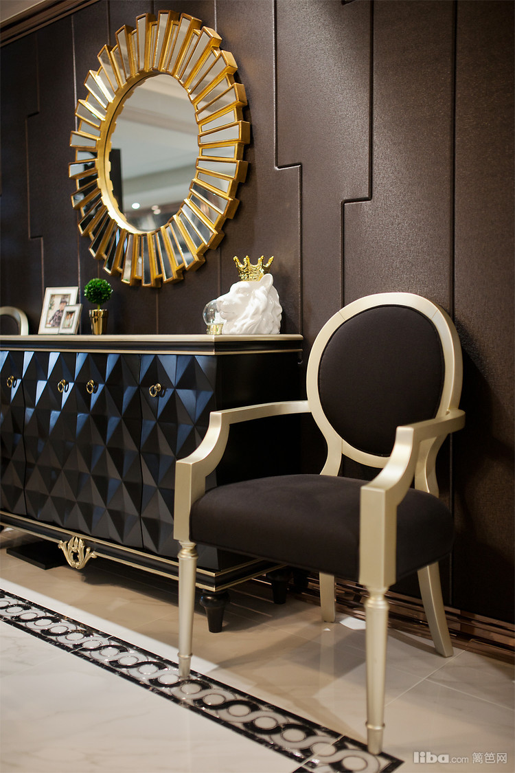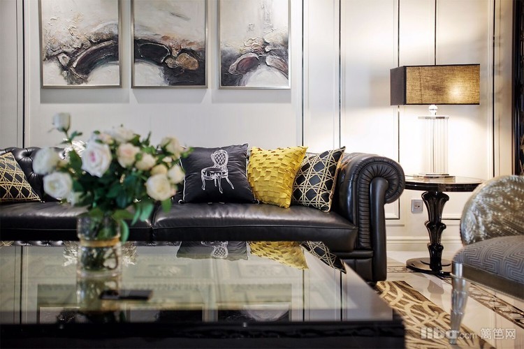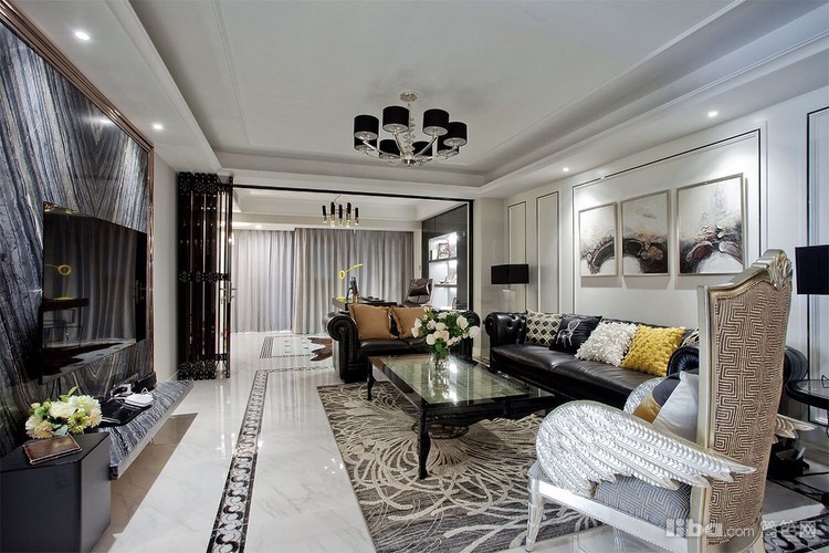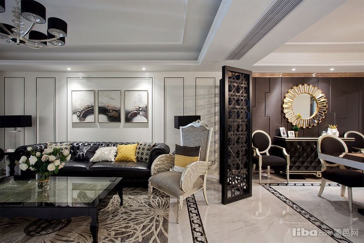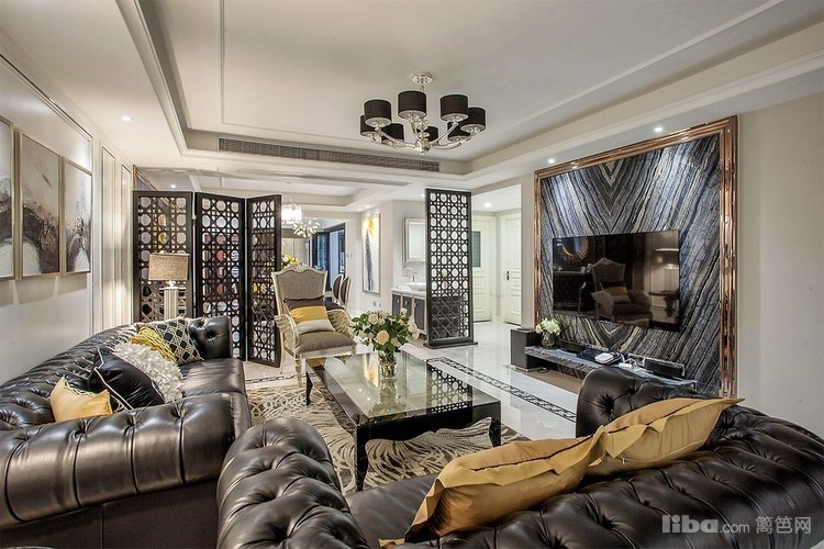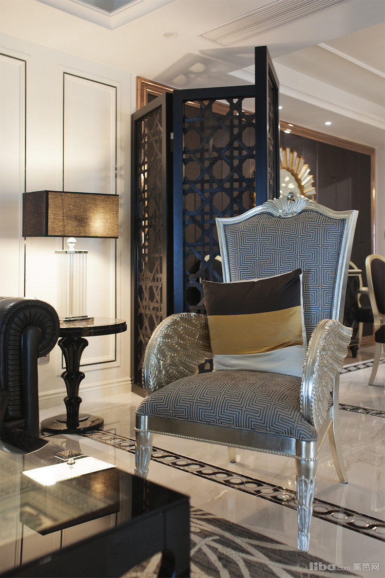 设计师利用冷色调装饰空间,中式的屏风隔断,将客厅和餐厅区分开来,色彩鲜明的靠垫穿插搭配,皮质的沙发和羽翼单人沙发,低调奢华有内涵,将屋主的品味,格调得以展现。