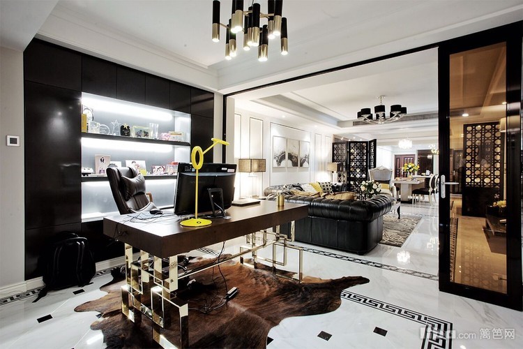 敞开式的书房,与客厅融为一体,重金属的桌腿以及极具个性的地毯,书架上的饰品及书籍,色彩鲜亮的台灯成了这里最抢眼的配饰。