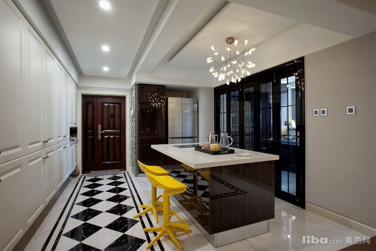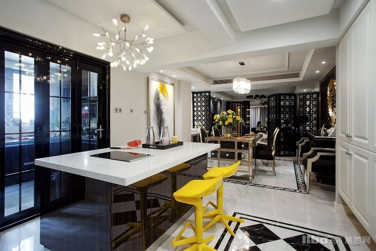 利用深色和白色作为空间的基底,恰当的黄色吧凳点缀,色彩简约却充满魅力。