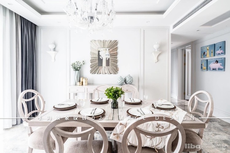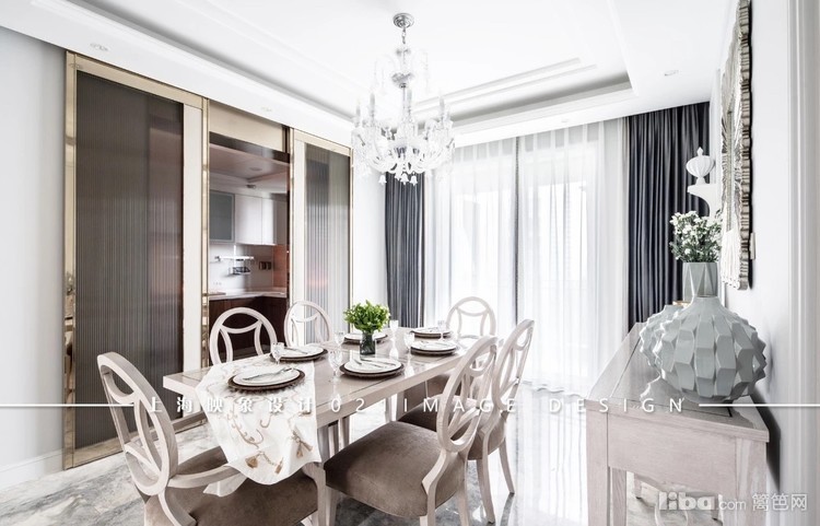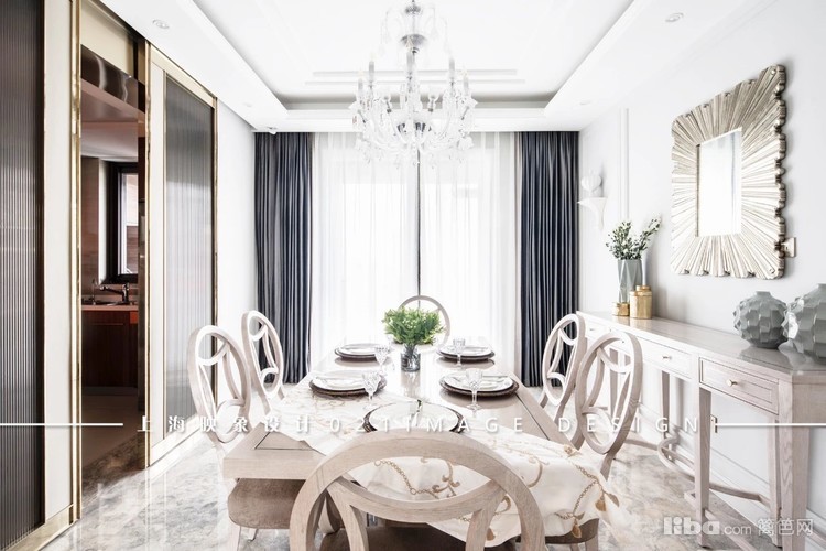 选择浅色系餐桌,配上深灰色窗帘和白色纱帘,原本咖色与金色的俗气感瞬时成为餐厅的亮点。