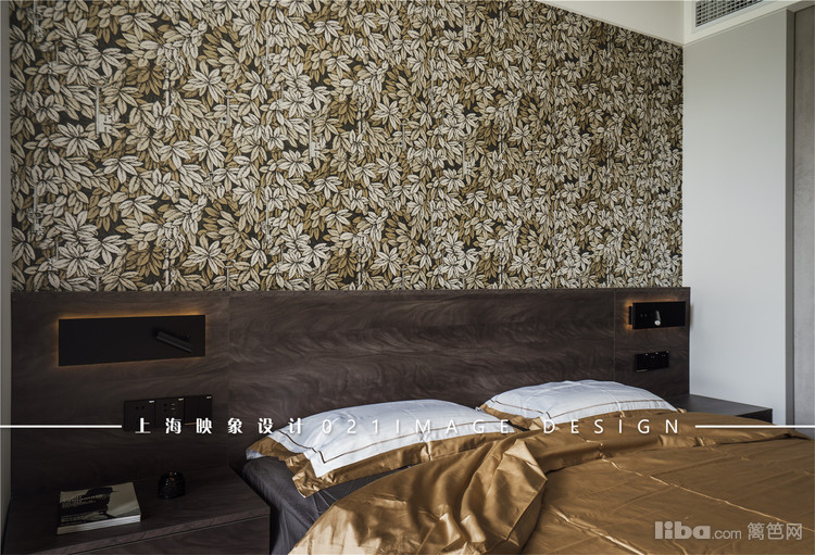 简约的卧室设计,深灰色木质床具,床头背景墙铺上英式墙纸,妥妥的酒店风格。