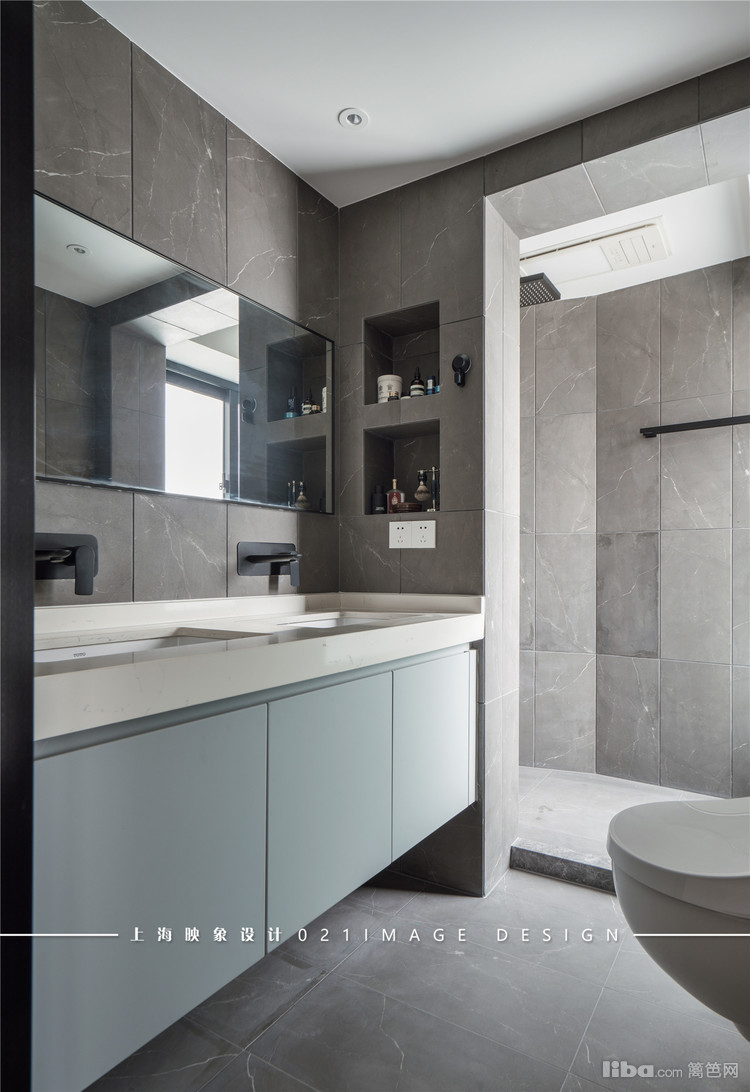 仿大理石纹的灰色墙地砖搭配青灰色的台盆柜,悬空的设计让整个空间干净整洁,容易打理,又满足了主人酒店情节。