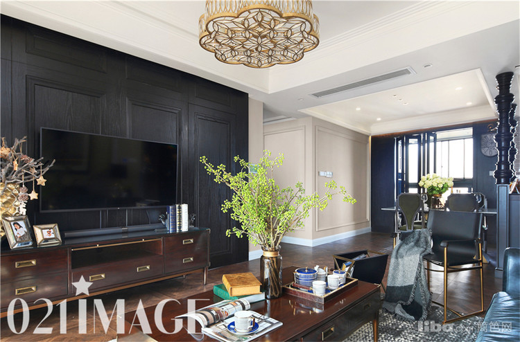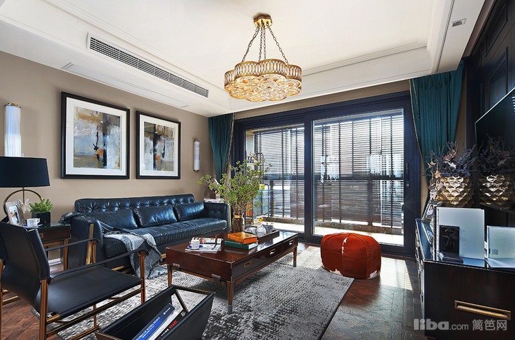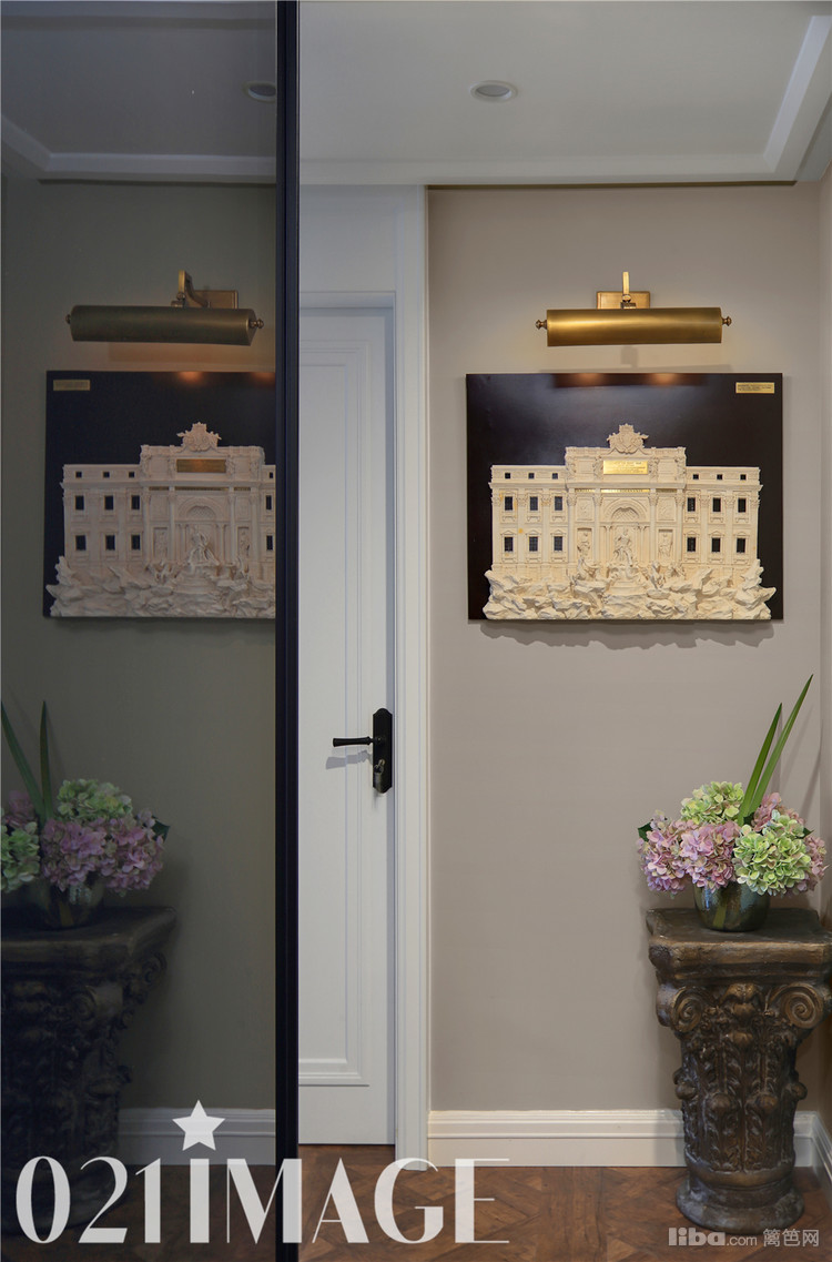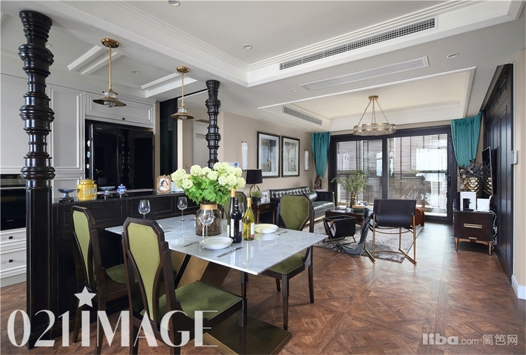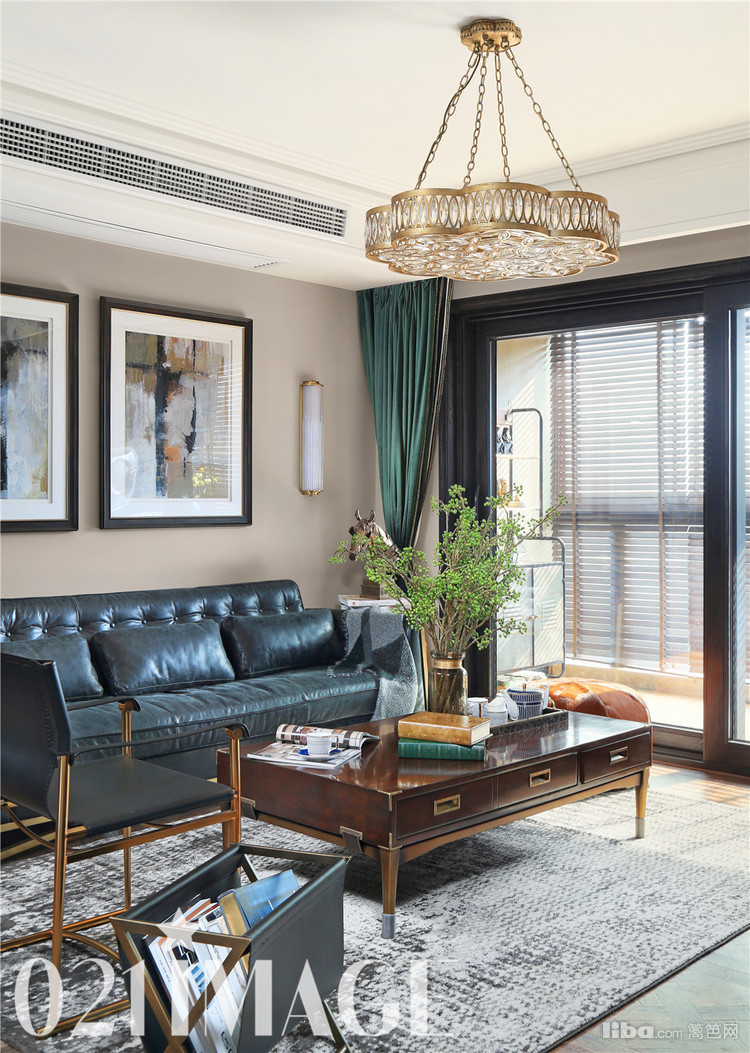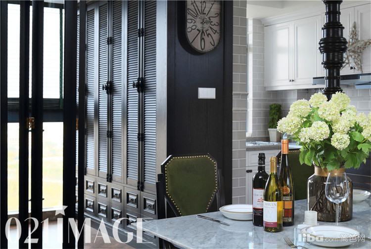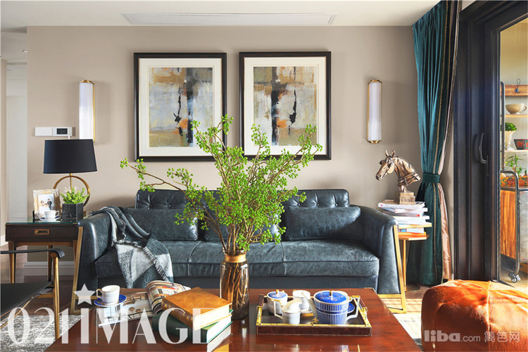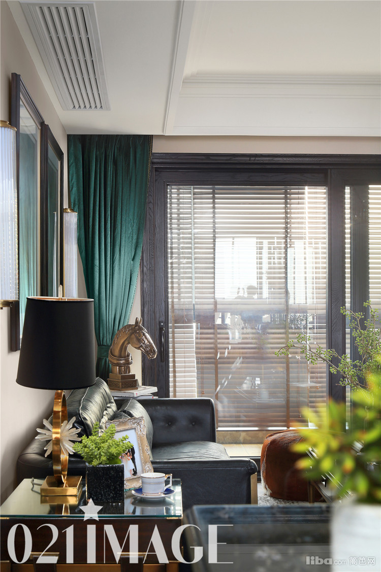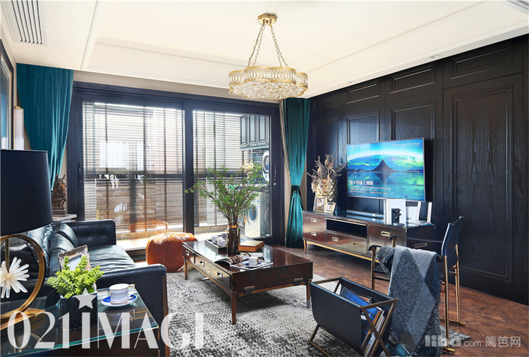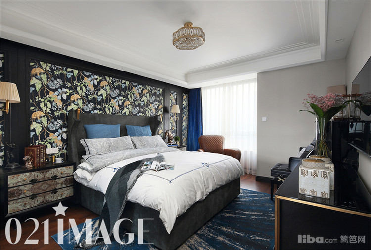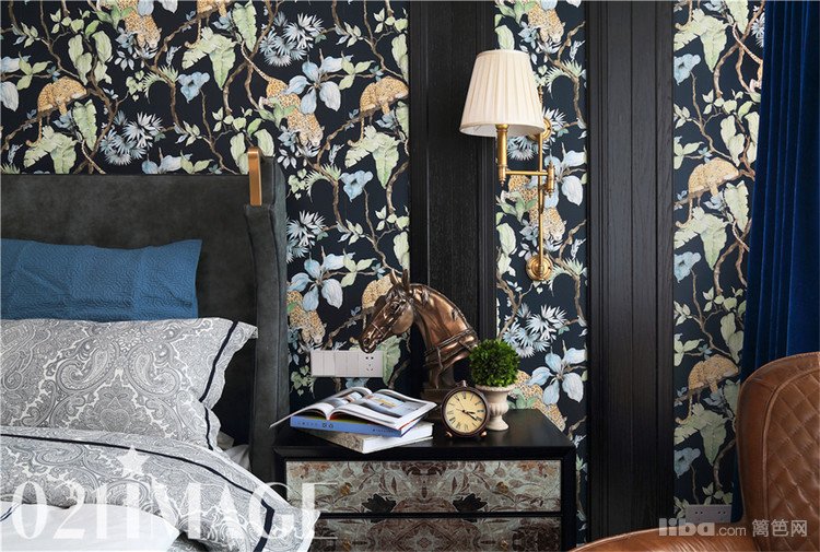 金属抽屉把手、孔雀蓝窗帘、繁花似锦墙纸