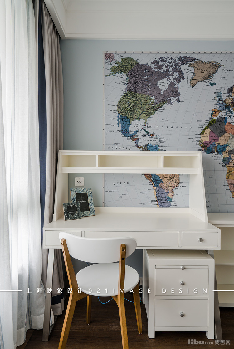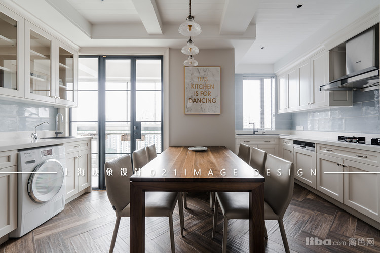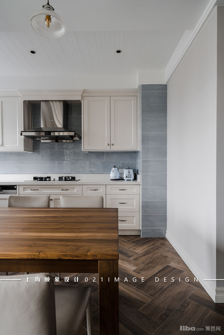 以餐厅为中心,分隔中式及西式烹饪区,搭配淡蓝色磁砖、线板柜及格状玻璃门,点缀美式的悠闲雅致。